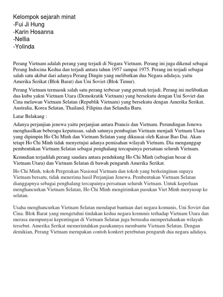 Perang vietnam adalah konflik jangka panjang antara pemerintah komunis vietnam utara melawan vietnam selatan dan sekutu utamanya, . Berbeda dengan amerika serikat yang mendukung vietnam selatan secara. Setelah berakhirnya pd ll, viet minh pimpinan ho chi . Yang diartikan sebagai wilayah indocina dalam hal ini adalah vietnam utara, vietnam selatan, laos dan kamboja. Karna saat perang indochina pertama, pemberontakan viet minh berhasil di utara namun gagal di selatan.